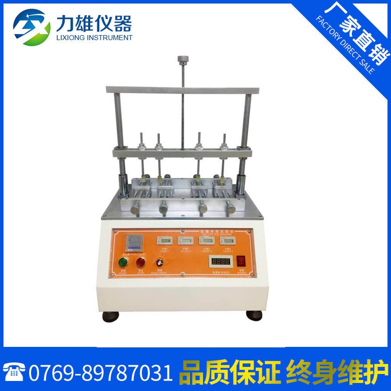 按键耐久试验机适用于手机、电脑、电子词典、蓝牙耳机、车载播放器、摇控器按键、车辆防盗器、传真机按键、MP5、MP4、MP3、按键开关、轻触开关、薄膜按键、橡胶按键、硅胶按键等各类按键进行寿命试验。本机是将产品分别置于对应工位的试验位置上,按键测试杆在一定的试验荷重、速度、行程、次数下模拟人对产品的使用寿命测试。