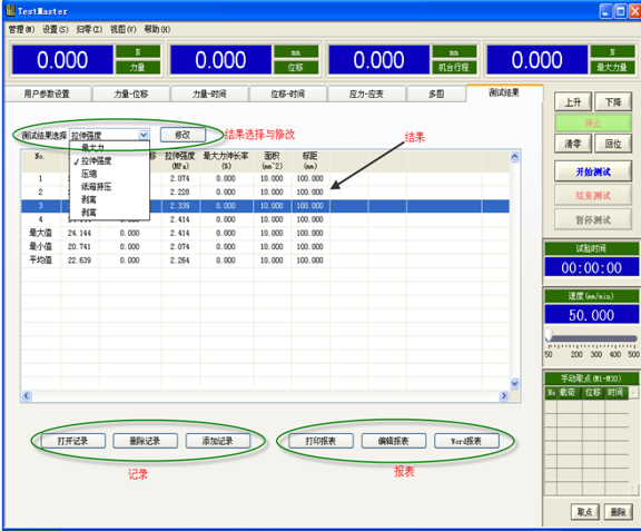 E.采用多线程并行处理技术,测试过程中实时同时显示力量-位移、力量-时间、位移-时间、应力-应变等曲线,可随意切换到想看的曲线画面,并可查看用户设置等。