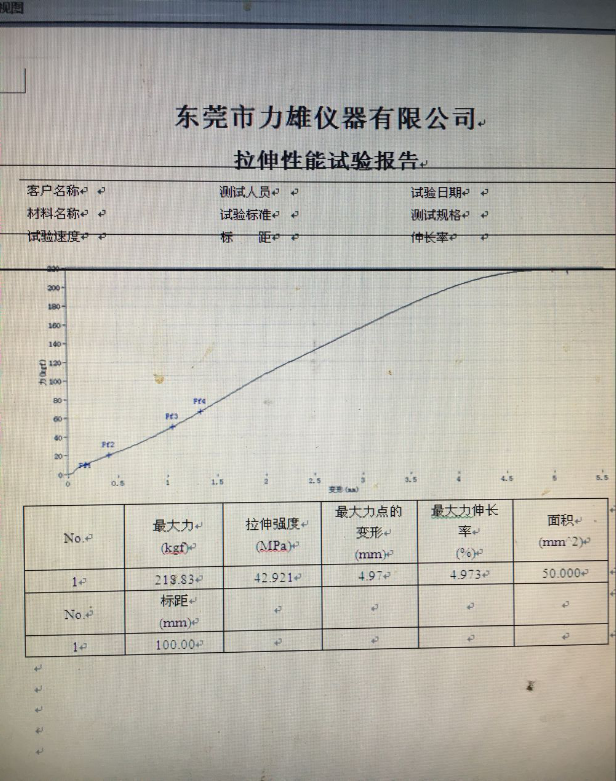 G.测试结束可自动存档、手动存档,测试完毕自动求算最大力量、上、下屈服强度、环法、逐步逼近法、非比例延伸强度、抗拉强度、抗压强度、任意点定伸长强度、定负荷延伸、弹性模量、延伸率、剥离区间最大值、最小值、平均值、净能量、总能量、弯曲模量、断点位移x%荷重、断点荷重X%位移、等等。备份:测试数据可保存在任意硬盘分区。
